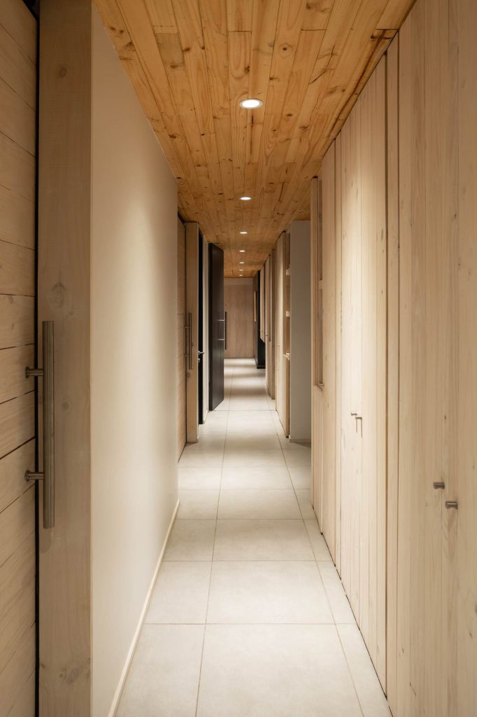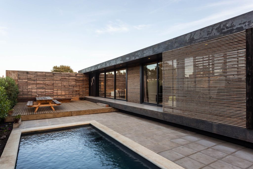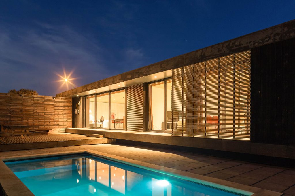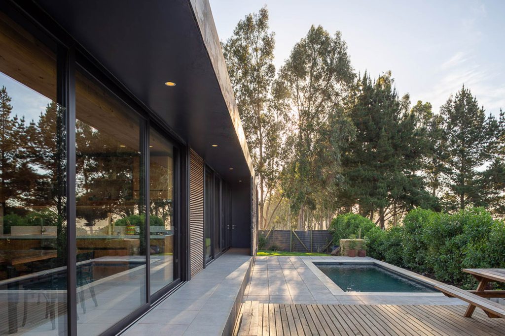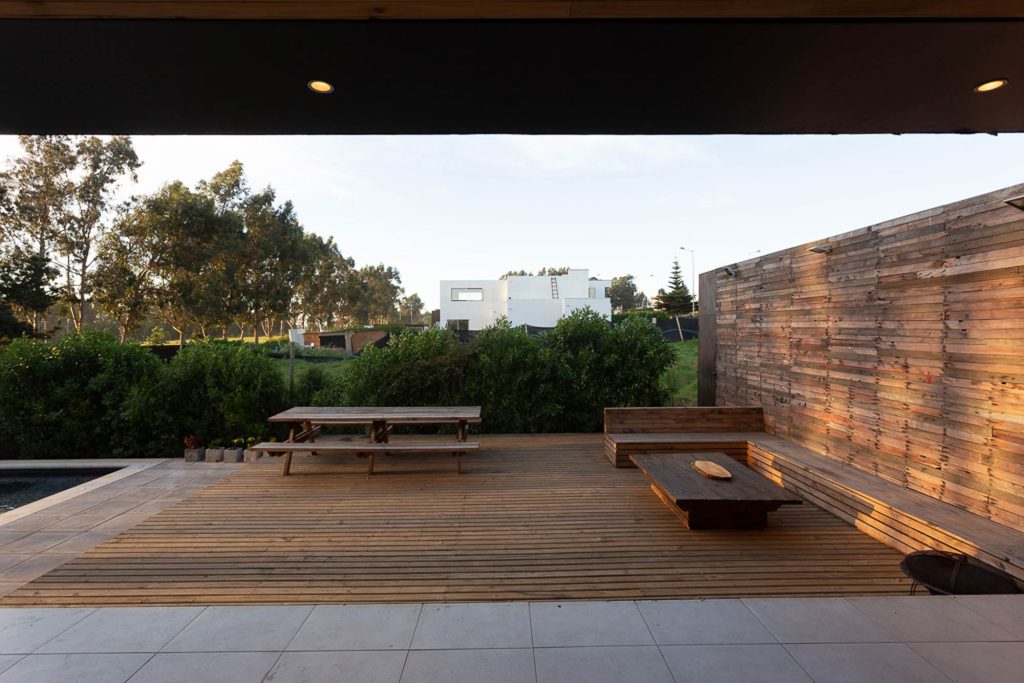 Los fuertes vientos que predominan en el verano desde el poniente, nos hicieron plantear la casa en paralelo a la longitud del terreno, en sentido oriente-poniente, formando un patio interior protegido como la zona predominante de la casa.