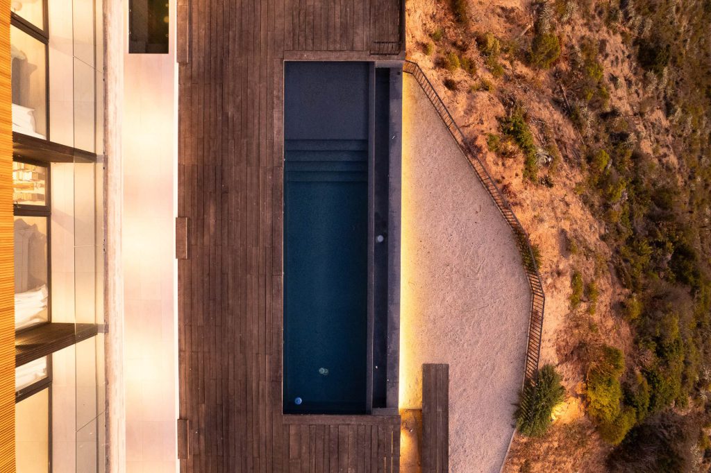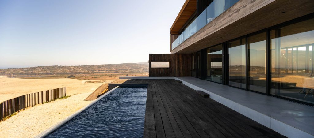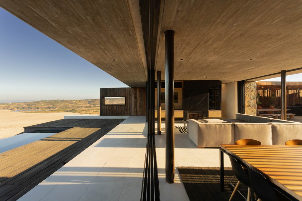 El lugar escogido para posicionar la casa presentaba algunas restricciones normativas, lo que determinó las dimensiones máximas del volumen principal: una caja de 22 x 9 metros que se eleva sobre el terreno, dejando libre el nivel de acceso. Los espacios destinados a uso público se sitúan en la planta baja, a la que se accede a través de un patio de 15 x 15 metros. Este patio acoge las principales actividades sociales y sirve como refugio para cuando surgen los vientos provenientes del océano. Se integra con el interior de la casa mediante unas ventanas retráctiles que se ocultan en los tabiques, lo que permite generar una relación fluida entre el interior y el exterior.
